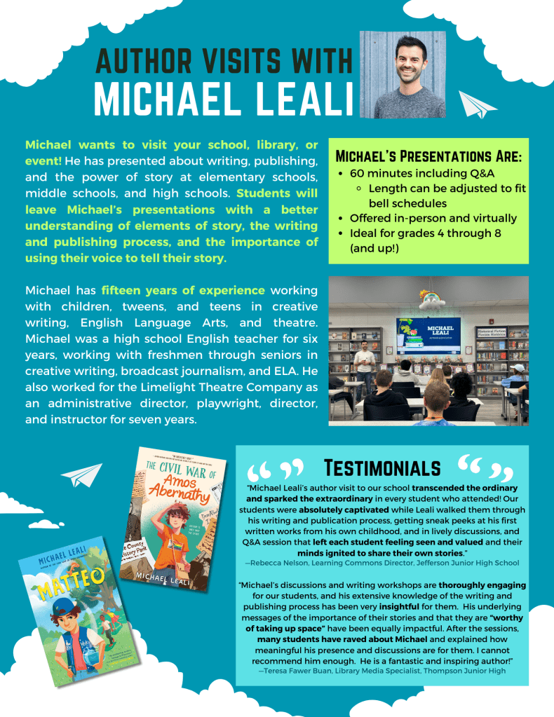 Michael Leali (he/him/his) is an award-winning writer and veteran educator. He earned his MFA in writing for children and young adults from Vermont College of Fine Arts, where he wrote the first draft of his second novel, Matteo. His widely-praised debut novel, The Civil War of Amos Abernathy, won the prestigious Golden Kite Award in 2023 and was a finalist for the Lambda Literary award among many other honors.